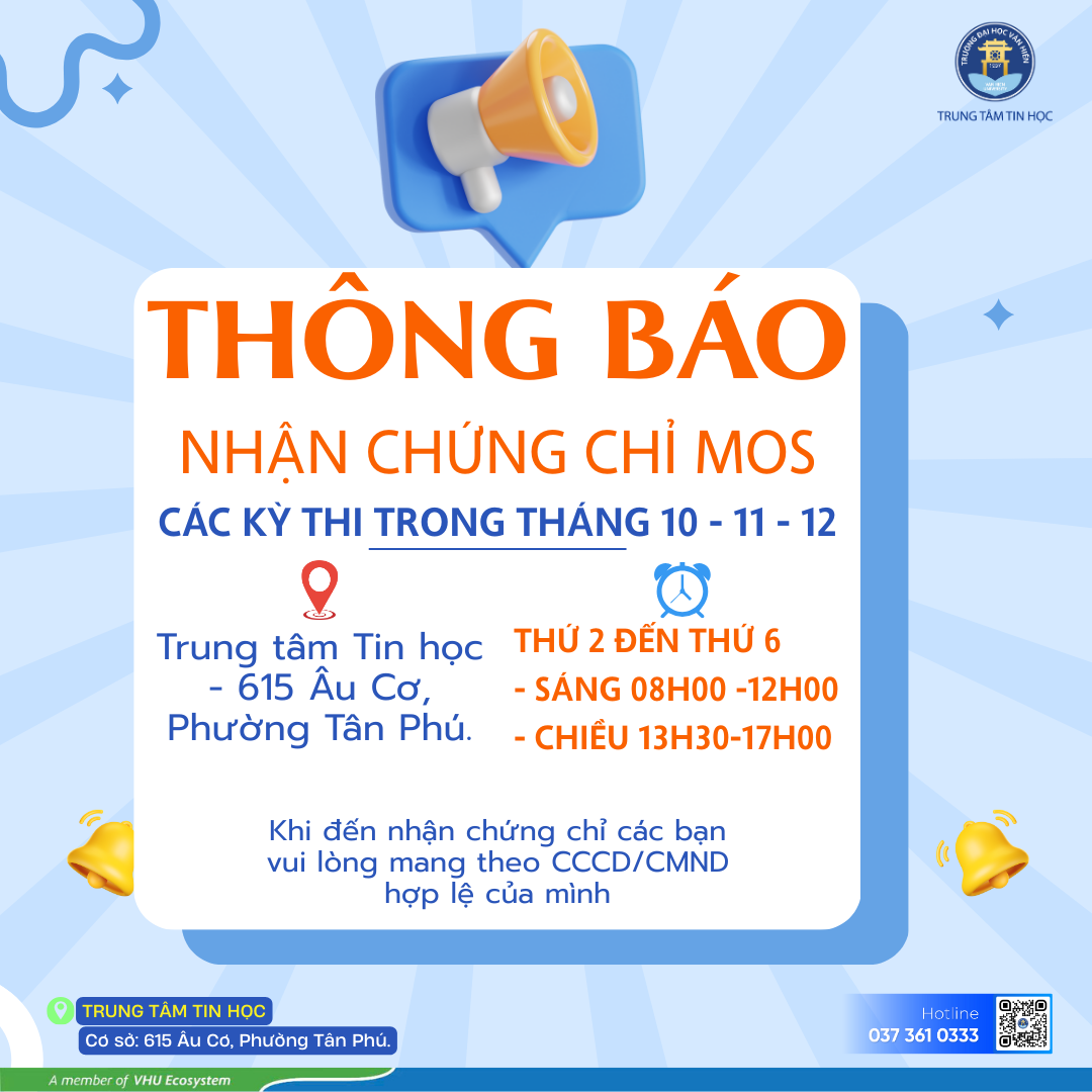 Hiện nay, Trung tâm Tin học – Trường Đại học Văn Hiến đã tiếp nhận chứng chỉ MOS của các bạn thí sinh tham gia các kỳ thi trong tháng 10, 11 và 12 do IIG Việt Nam chuyển về.